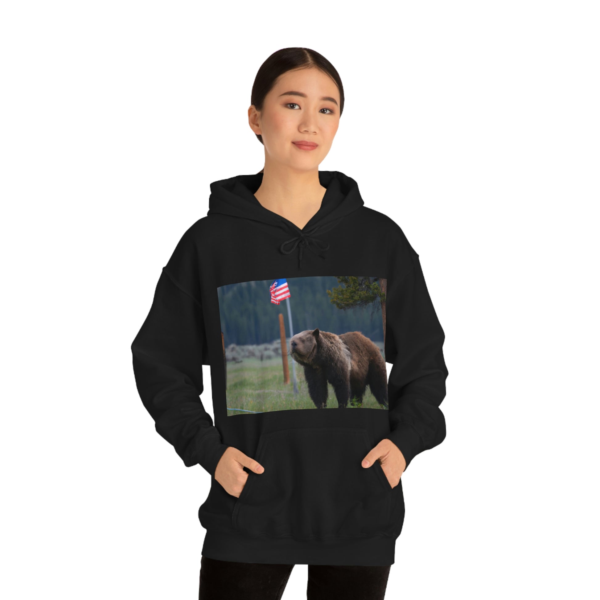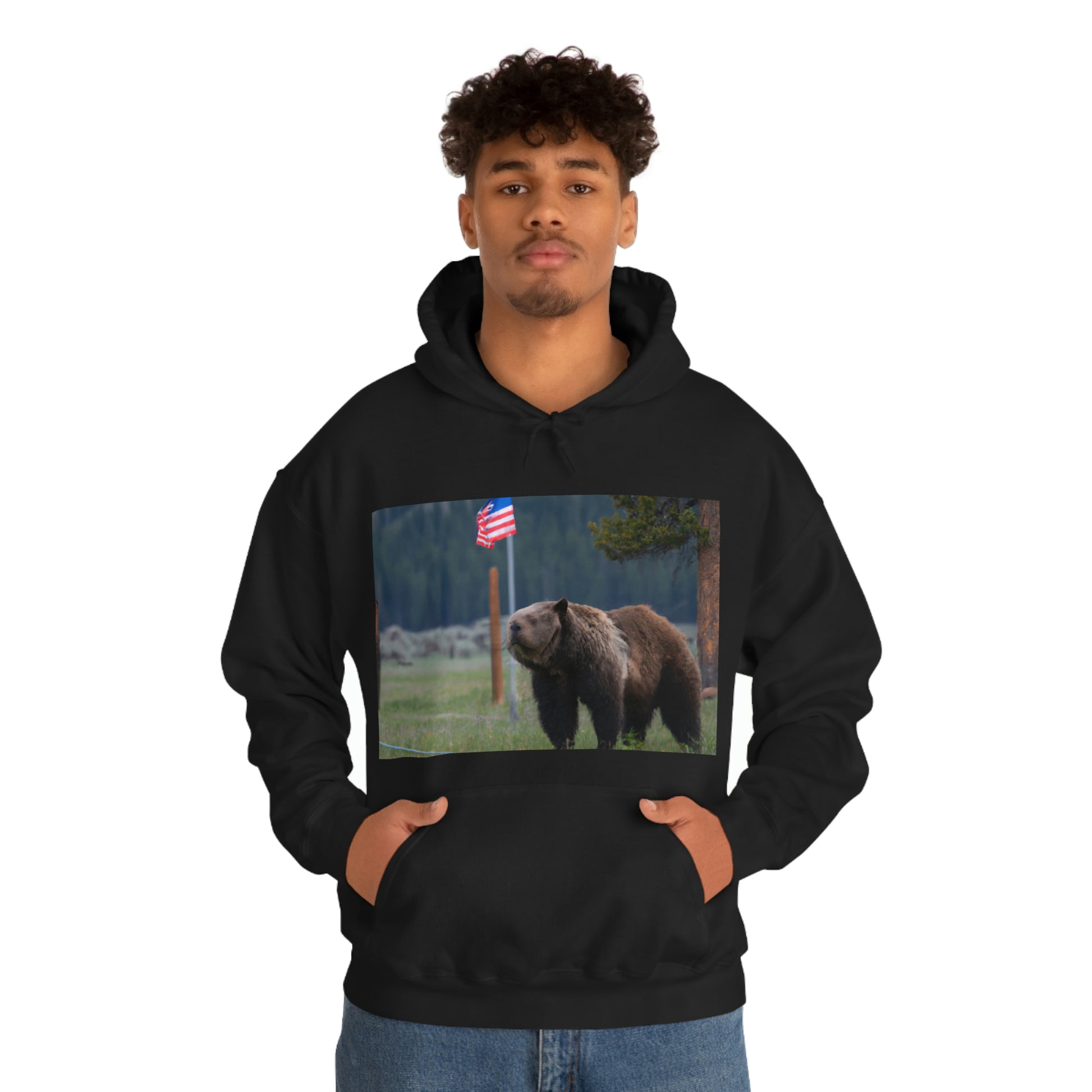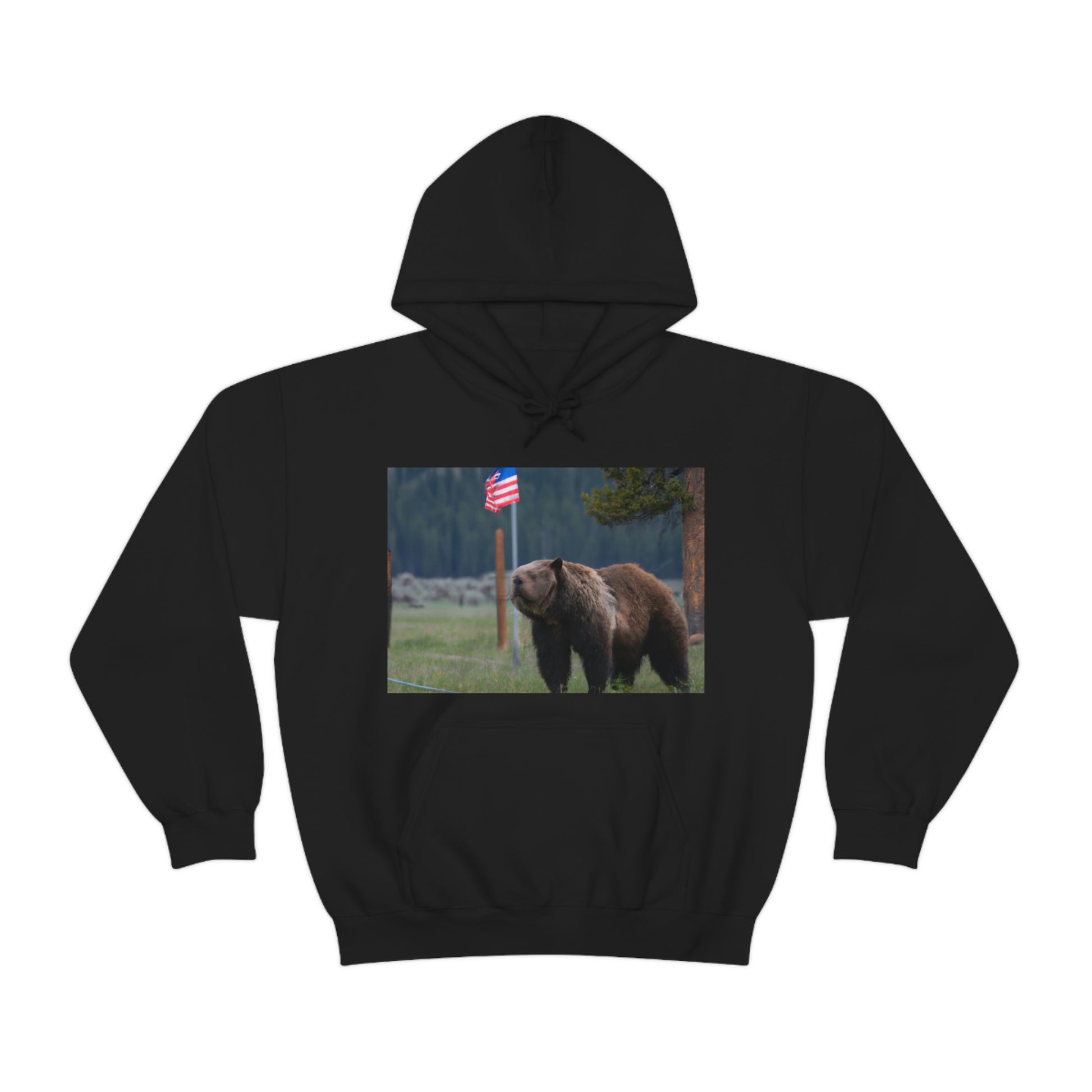 A canvas print of the majestic grizzly bear standing proudly in the Montana wilderness surrounded by American flags will bring a touch of the wild to any home. It celebrates the beauty of nature and of America, sure to be a unique focal point for any room. #GrizzlyBear #Montana #AmericanFlag #CanvasPrint #WallDecor #HomeDecor #Wilderness #Nature #Majestic #UniqueDecor #FocalPoint