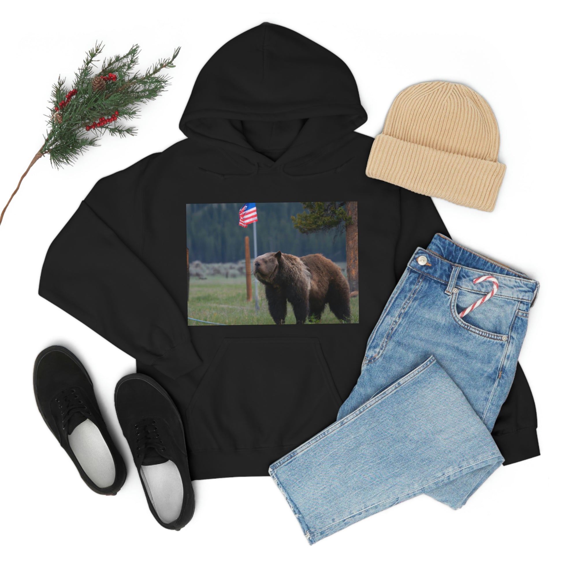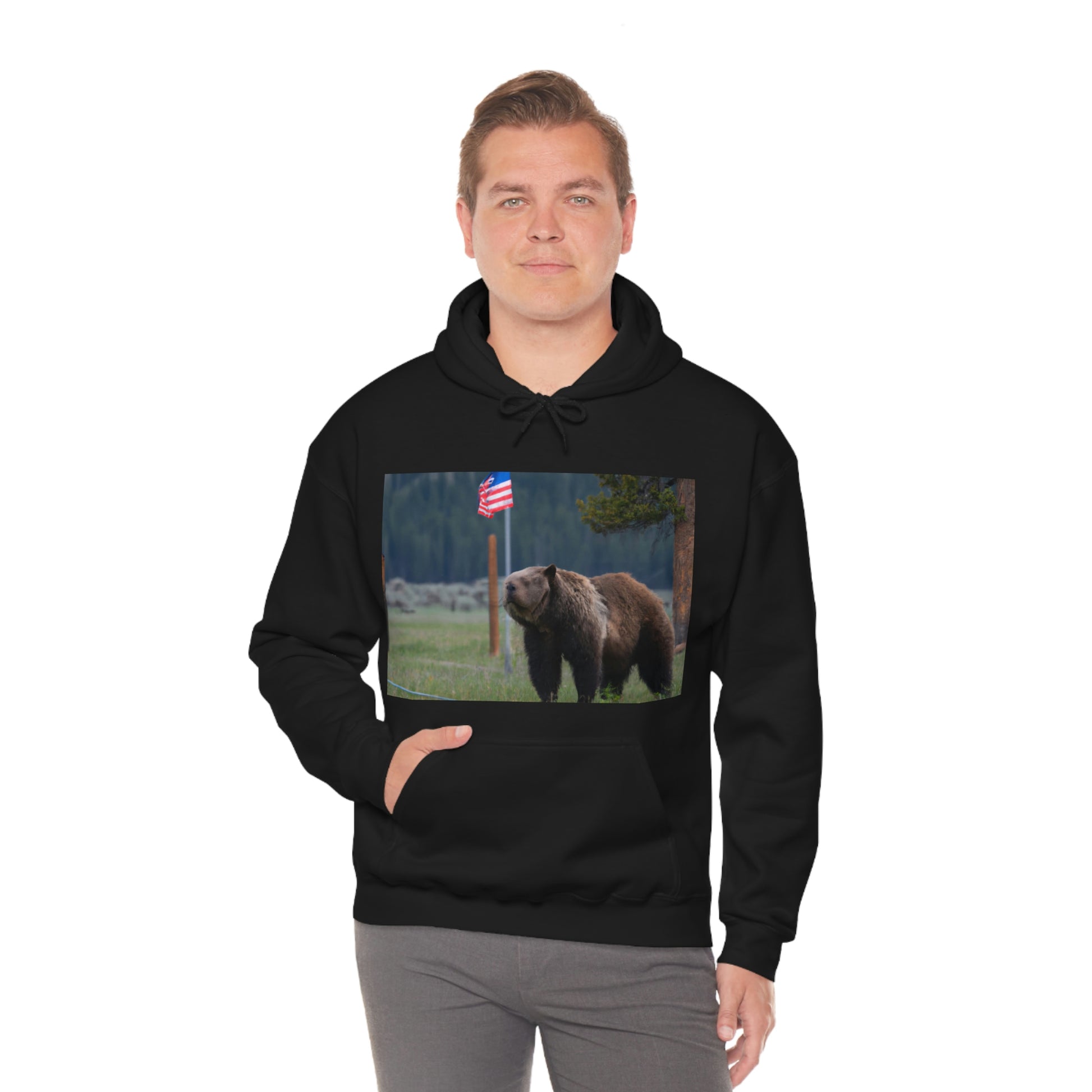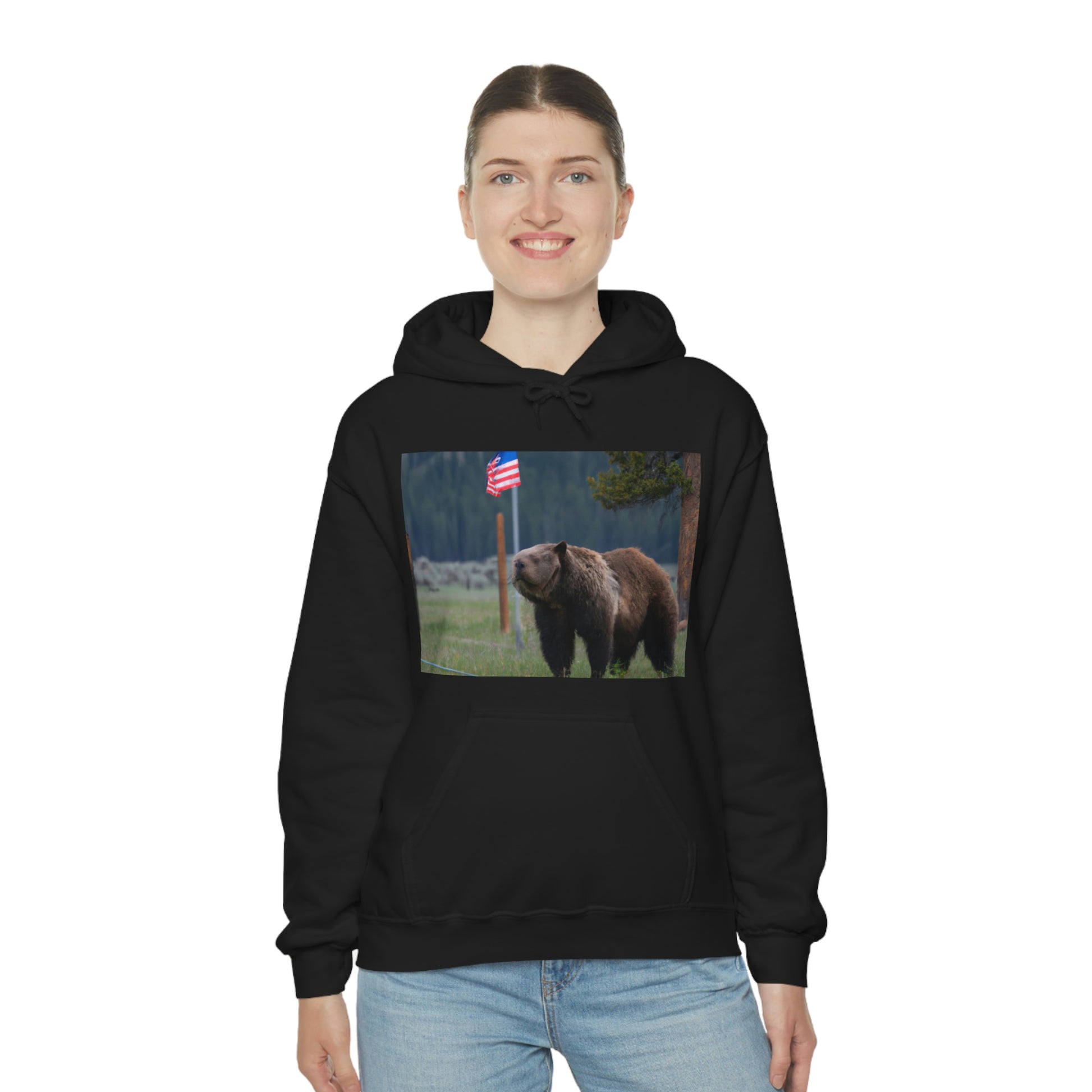 A canvas print of the majestic grizzly bear standing proudly in the Montana wilderness surrounded by American flags will bring a touch of the wild to any home. It celebrates the beauty of nature and of America, sure to be a unique focal point for any room. #GrizzlyBear #Montana #AmericanFlag #CanvasPrint #WallDecor #HomeDecor #Wilderness #Nature #Majestic #UniqueDecor #FocalPoint
